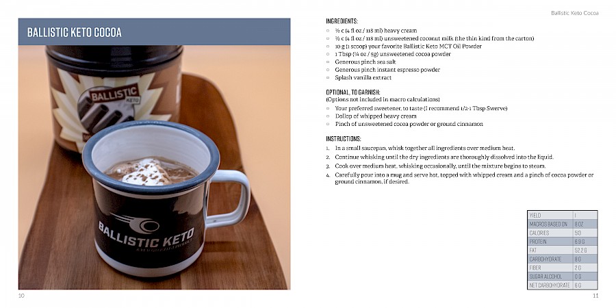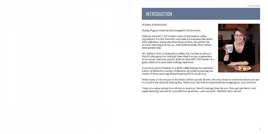 Layout baking recipe book based on client's product line of MCT Oil Powder. Create system for displaying recipes of varying length with images in irregular proportions. Provided final production files according to distributors' specifications.